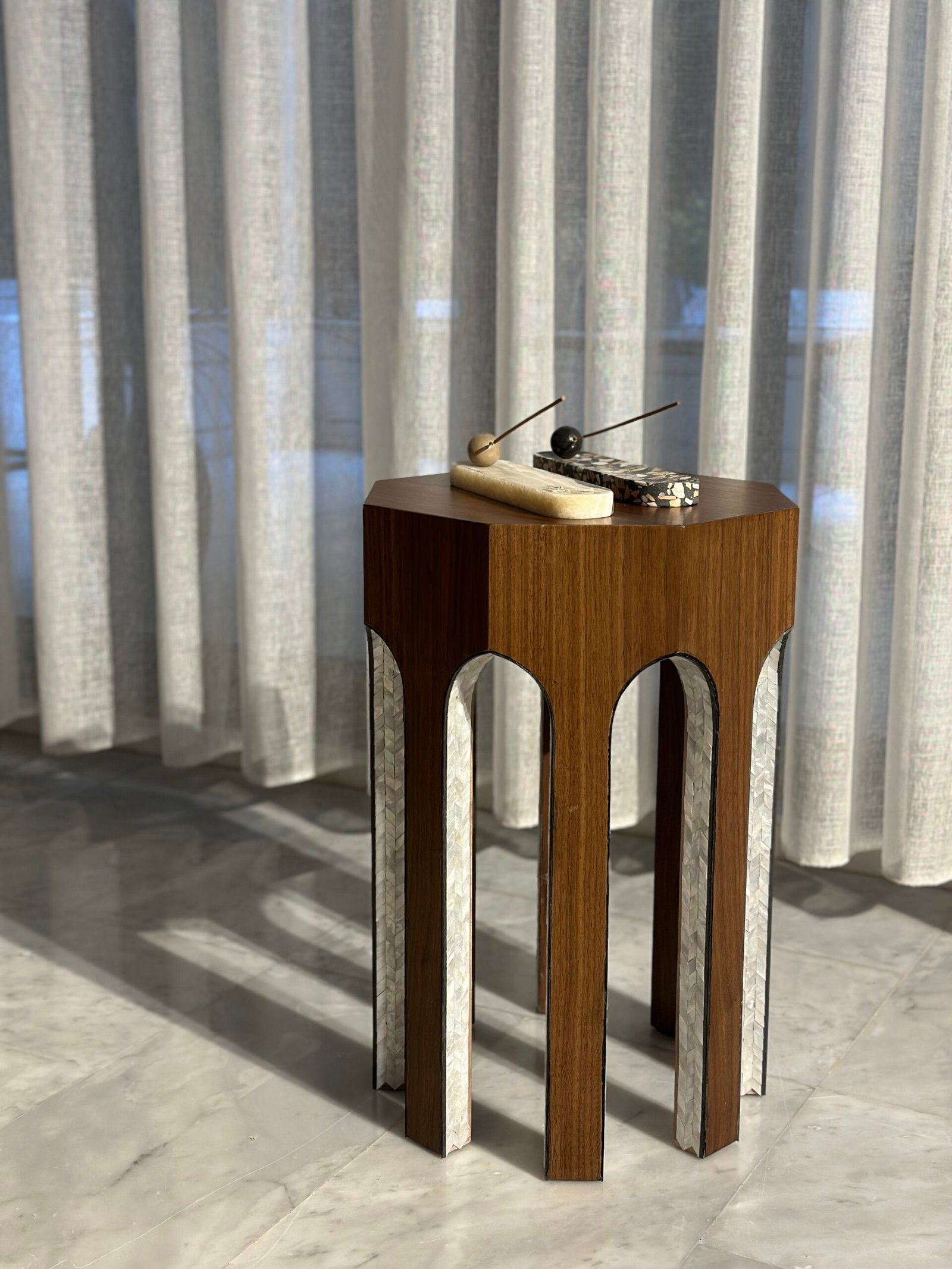 This side table is a sculptural interpretation of architectural form, distinguished by its bold geometry and refined material contrast. The hexagonal top and carved arch-like legs create a strong, structured silhouette with a contemporary presence.