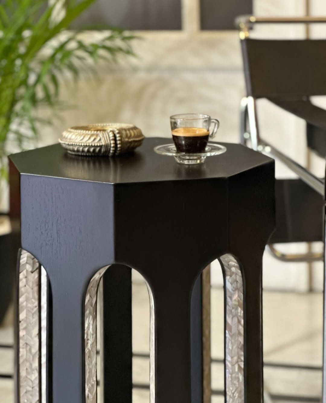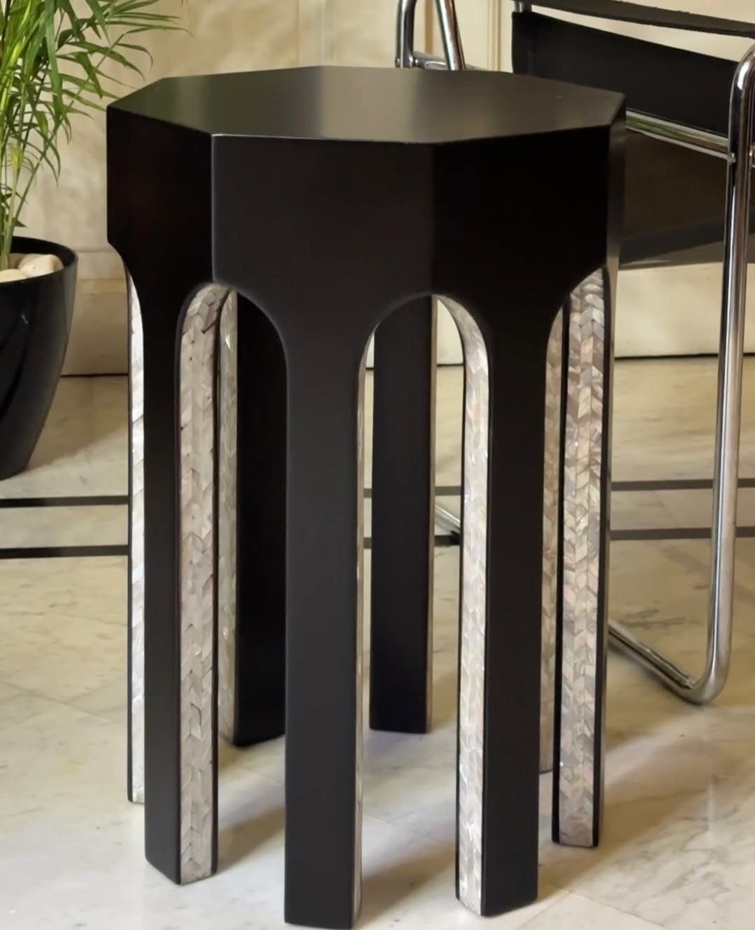 Finished in deep black, the design is elevated by mother-of-pearl inlay detailing integrated within the inner surfaces of the legs. The natural iridescence of the shell introduces subtle luminosity and depth, creating a striking contrast against the matte black wood finish.
