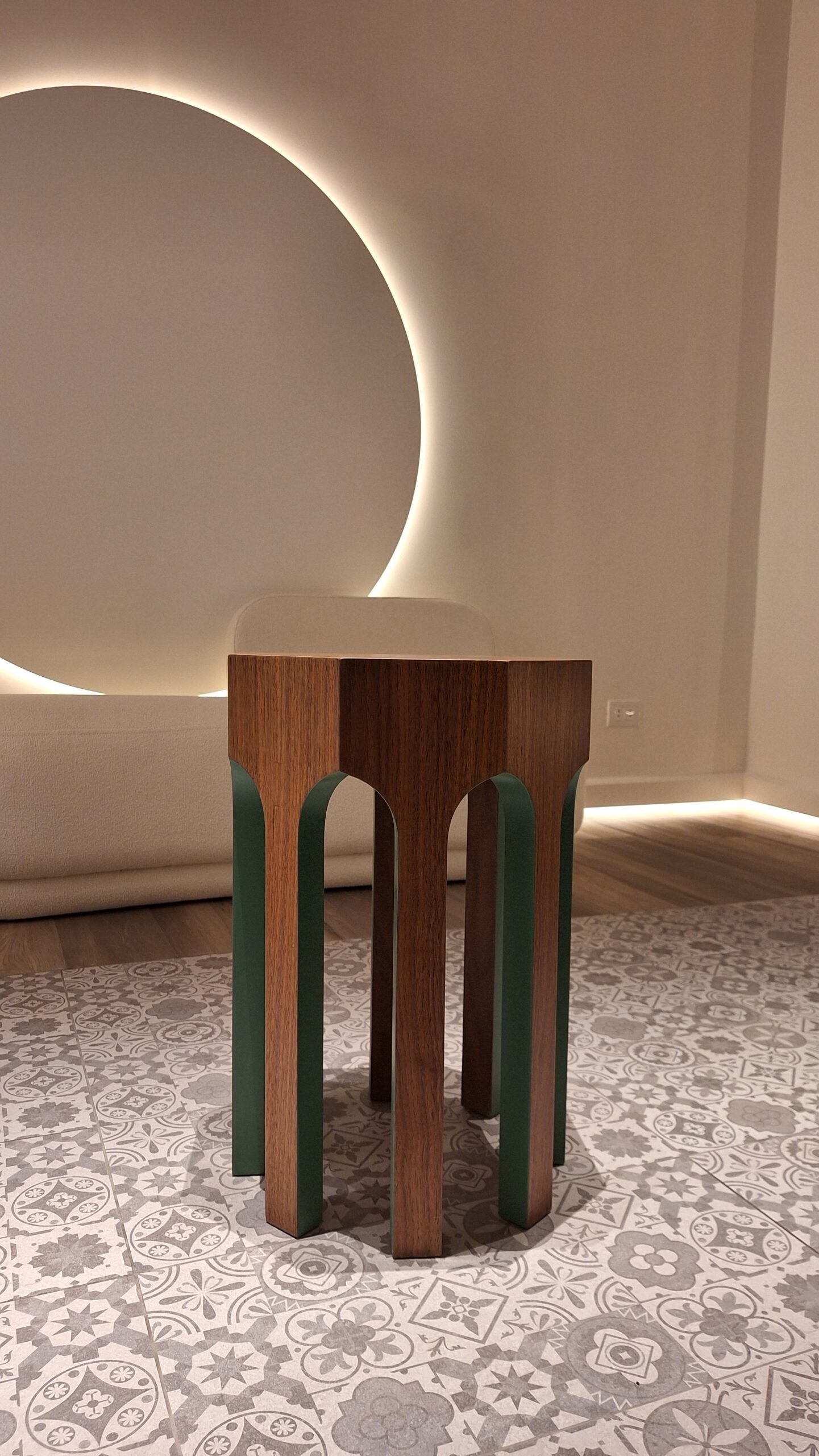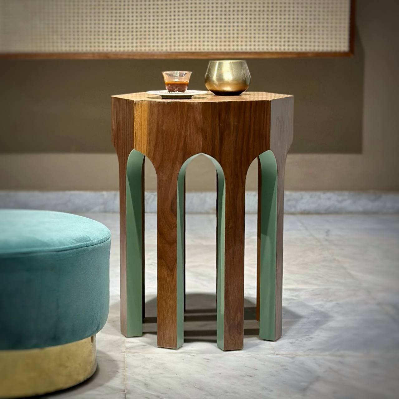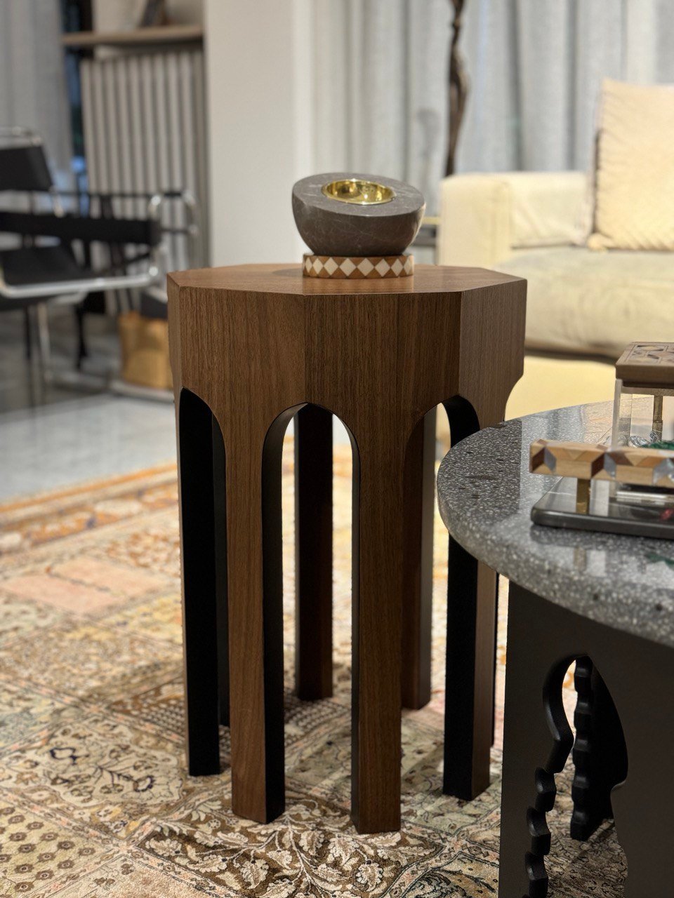 This side table is a sculptural piece that explores geometry, proportion, and contrast. Defined by its hexagonal top and distinctive leg structure, the design creates a strong architectural presence while maintaining visual lightness.