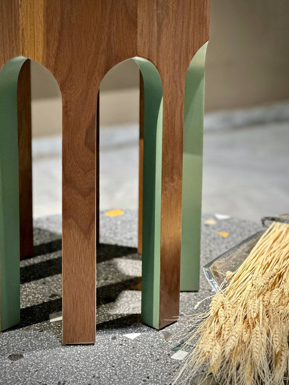 Crafted from solid wood, the table features carved arch-like cutouts along its legs, introducing rhythm and depth to the form. The subtle contrast between the natural wood finish and the accent-toned inner surfaces enhances the table’s graphic character without overpowering its clean silhouette.