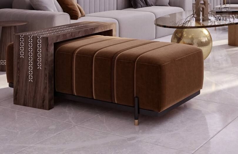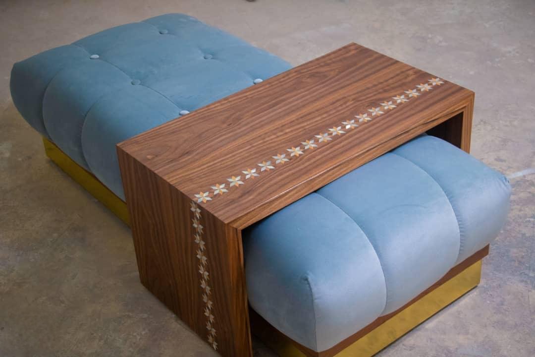 The C-table is distinguished by delicate mother of pearl inlay, adding a subtle artisanal accent that contrasts beautifully with the warm wood tones. This thoughtful integration transforms the piece into both seating and surface, ideal for refined living spaces.