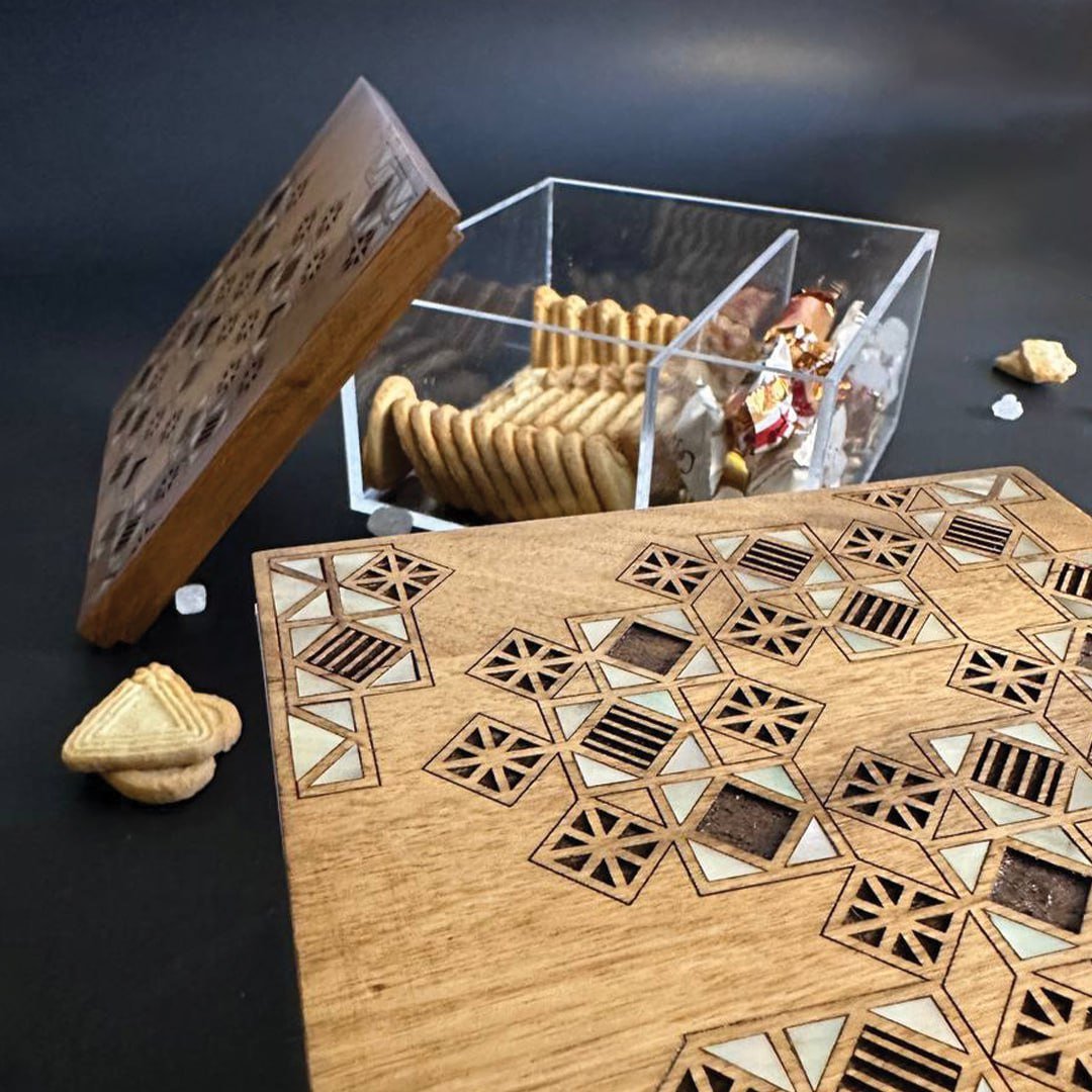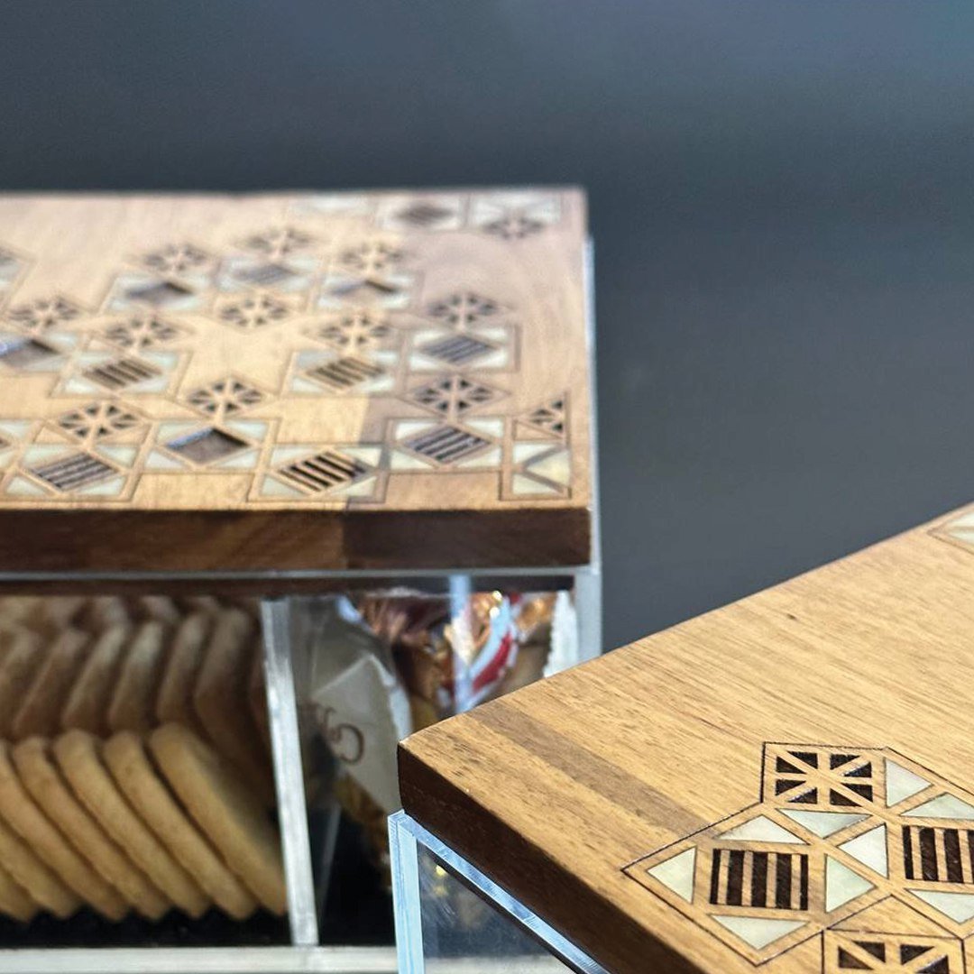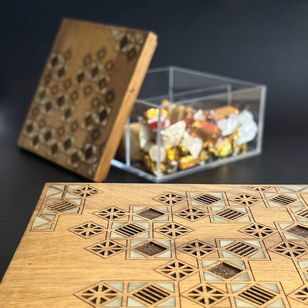 Plexi box with a wooden top and mother-of-pearl inlay.