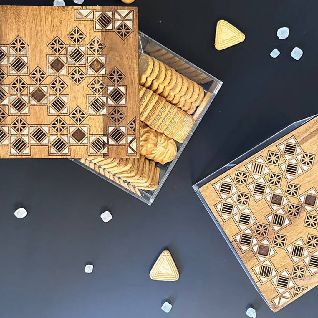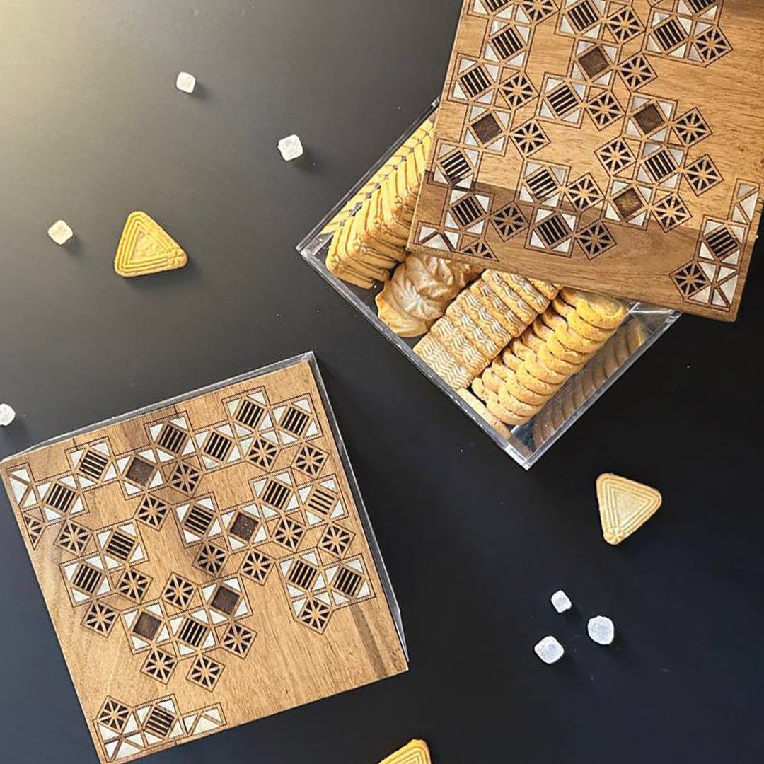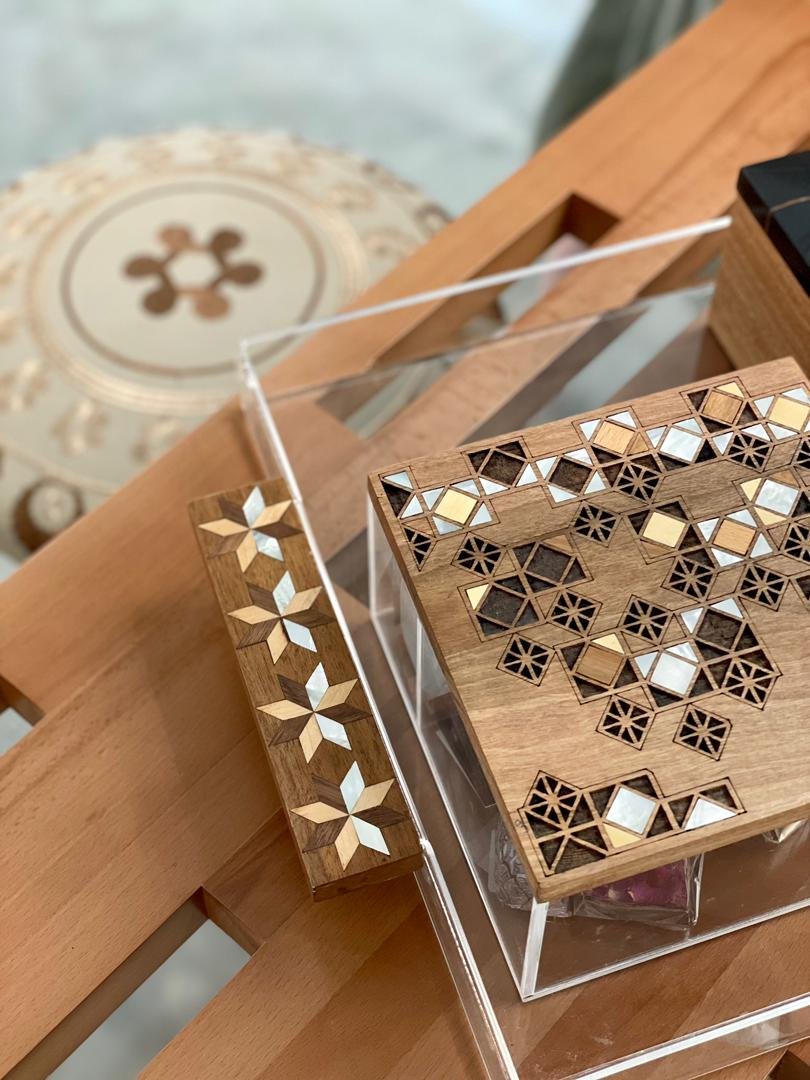 Plexi box with a wooden top and mother-of-pearl inlay.