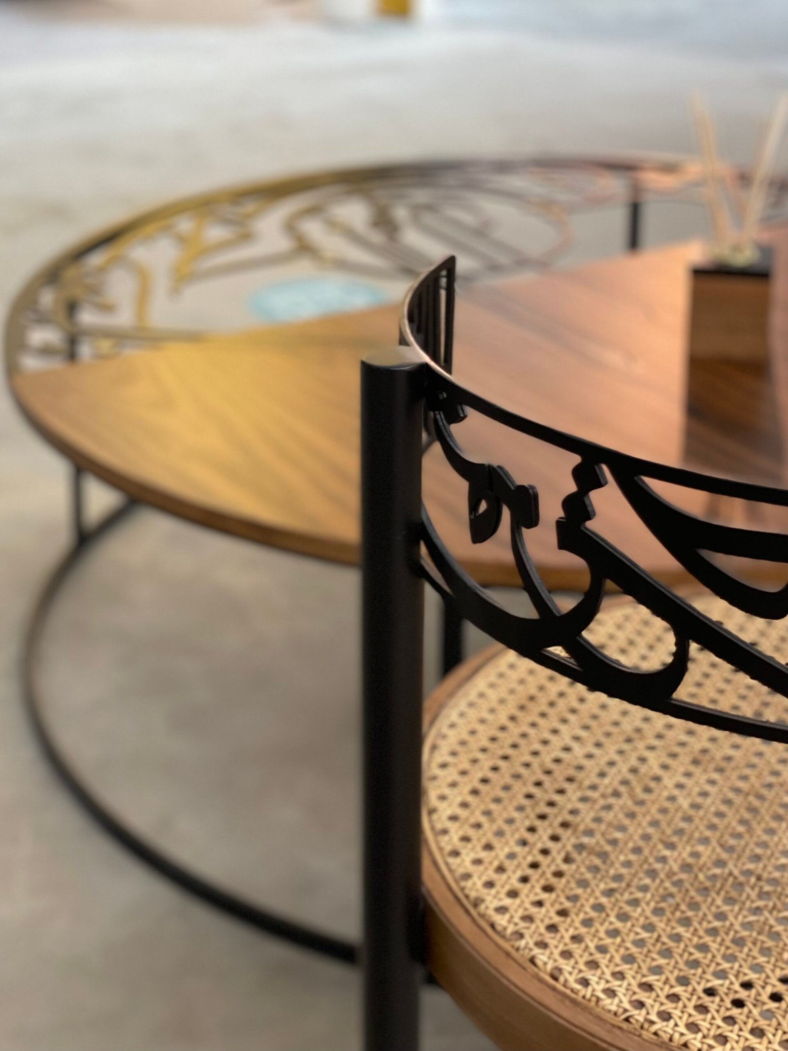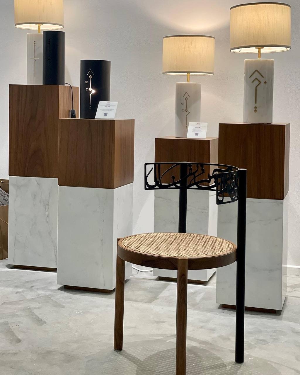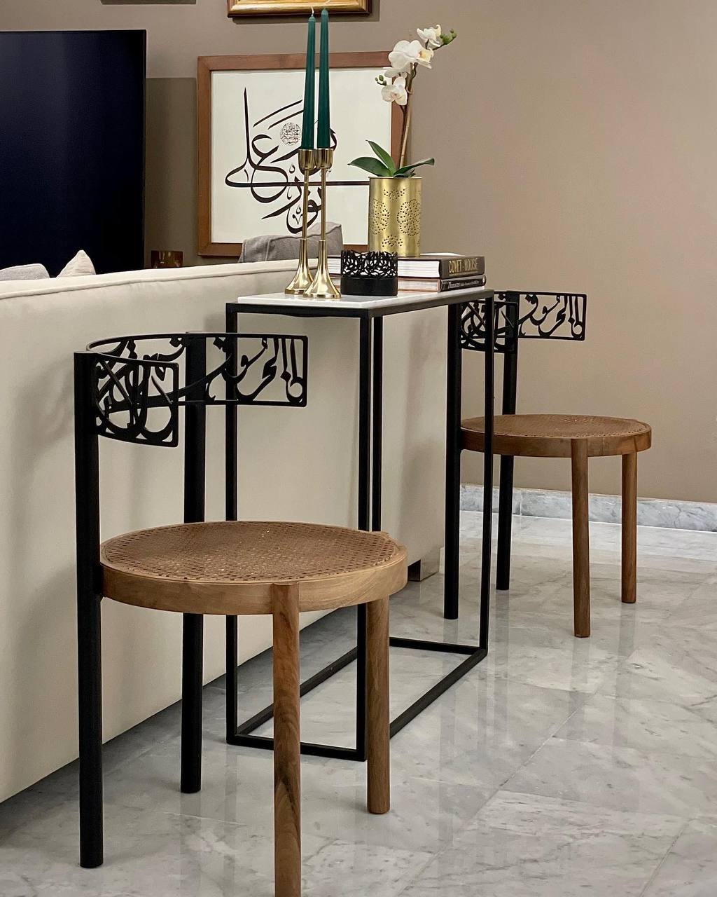 A signature accent chair that celebrates art and function. Featuring a handwoven rattan seat and a sleek wooden frame, the design is elevated by a metal backrest inspired by Arabic calligraphy. This fusion of tradition and modern design makes the chair not just seating, but a cultural statement piece. Perfect for living rooms, lounges, or as an artistic corner accent.