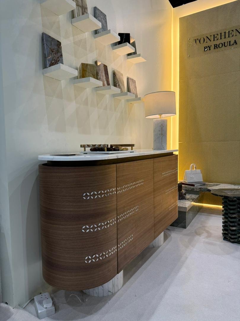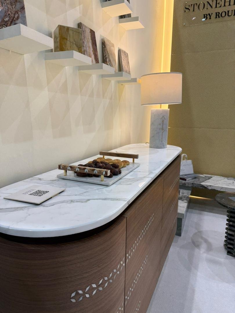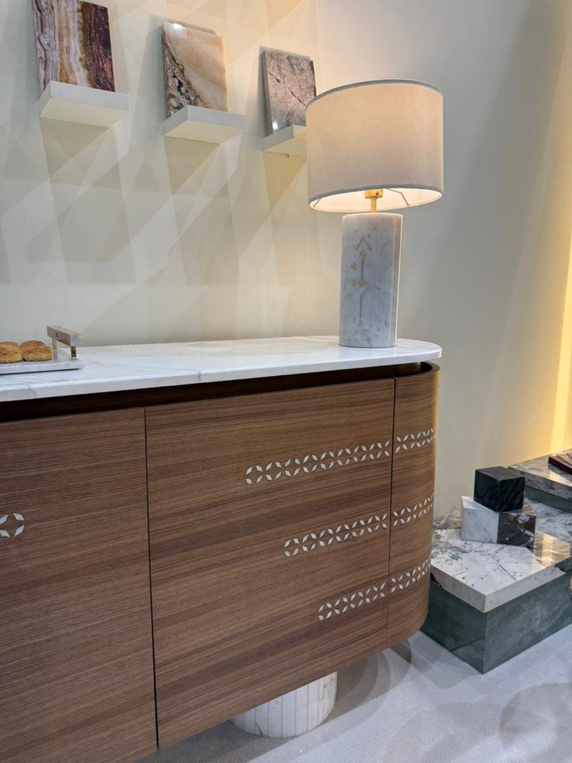 Made of walnut wood with inlay of mother of pearl, real marble top, and base.