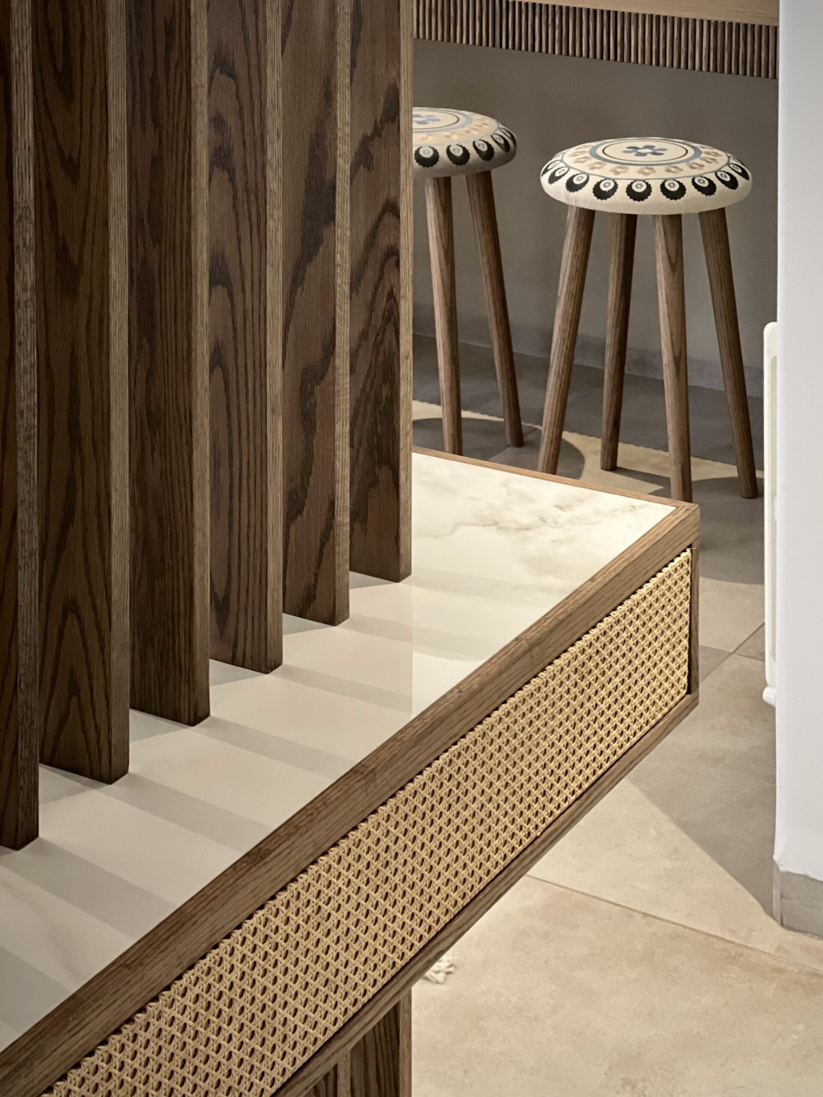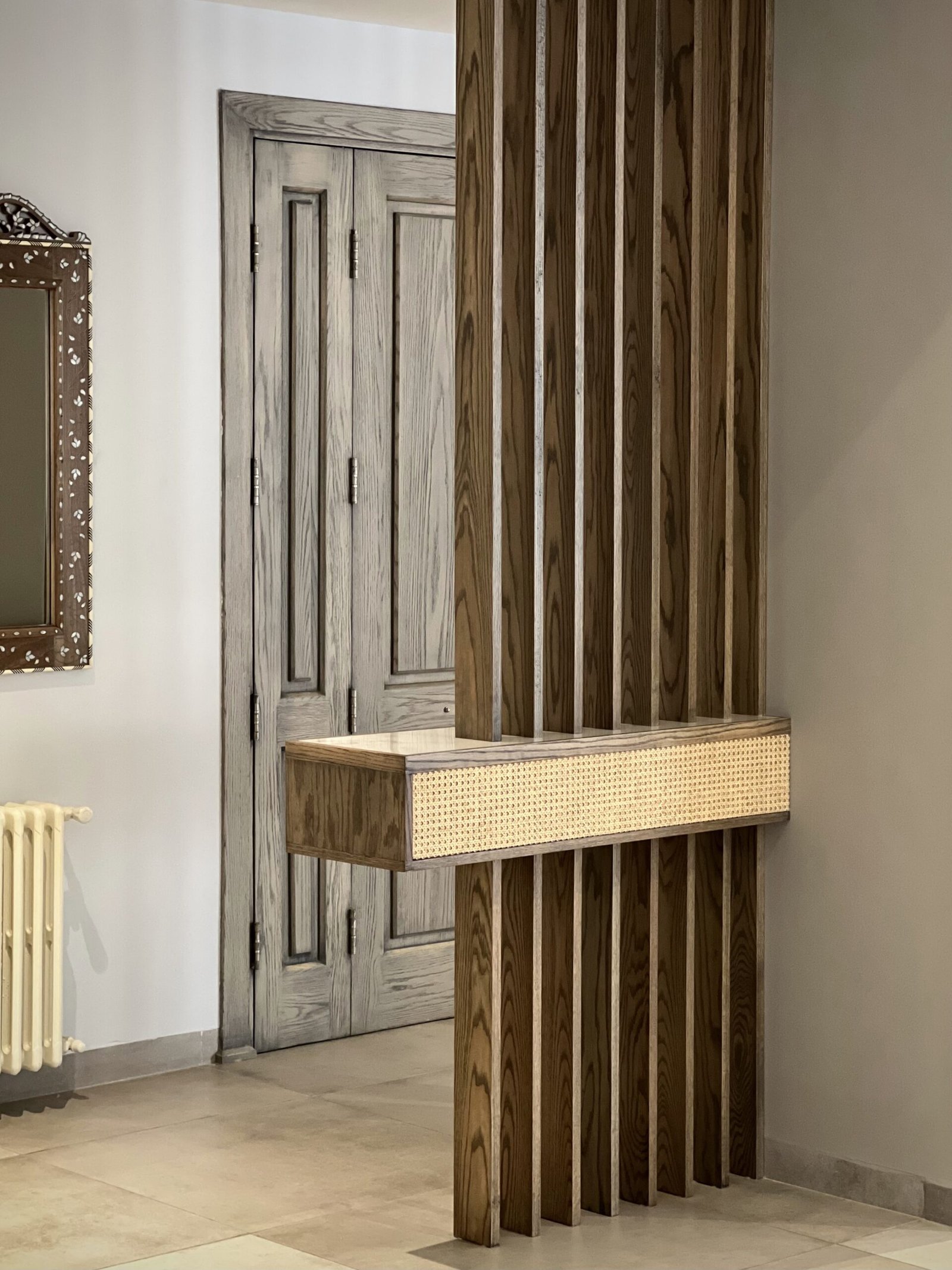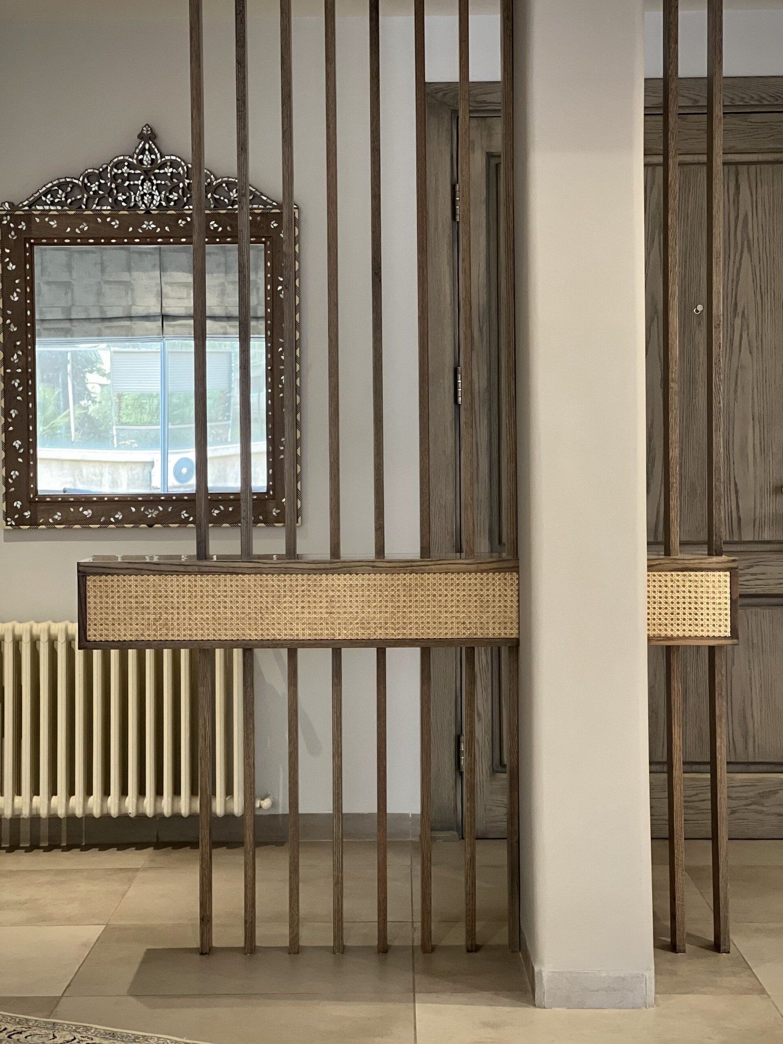 A refined wooden partition designed to subtly separate spaces while preserving an open, airy feel. The vertical wooden slats add architectural rhythm, while the central woven rattan panel introduces warmth and texture, creating a perfect balance between modern design and traditional craftsmanship. Ideal for entrances, living rooms, or transitional areas, this piece defines spaces without closing them off, adding both functionality and timeless elegance.