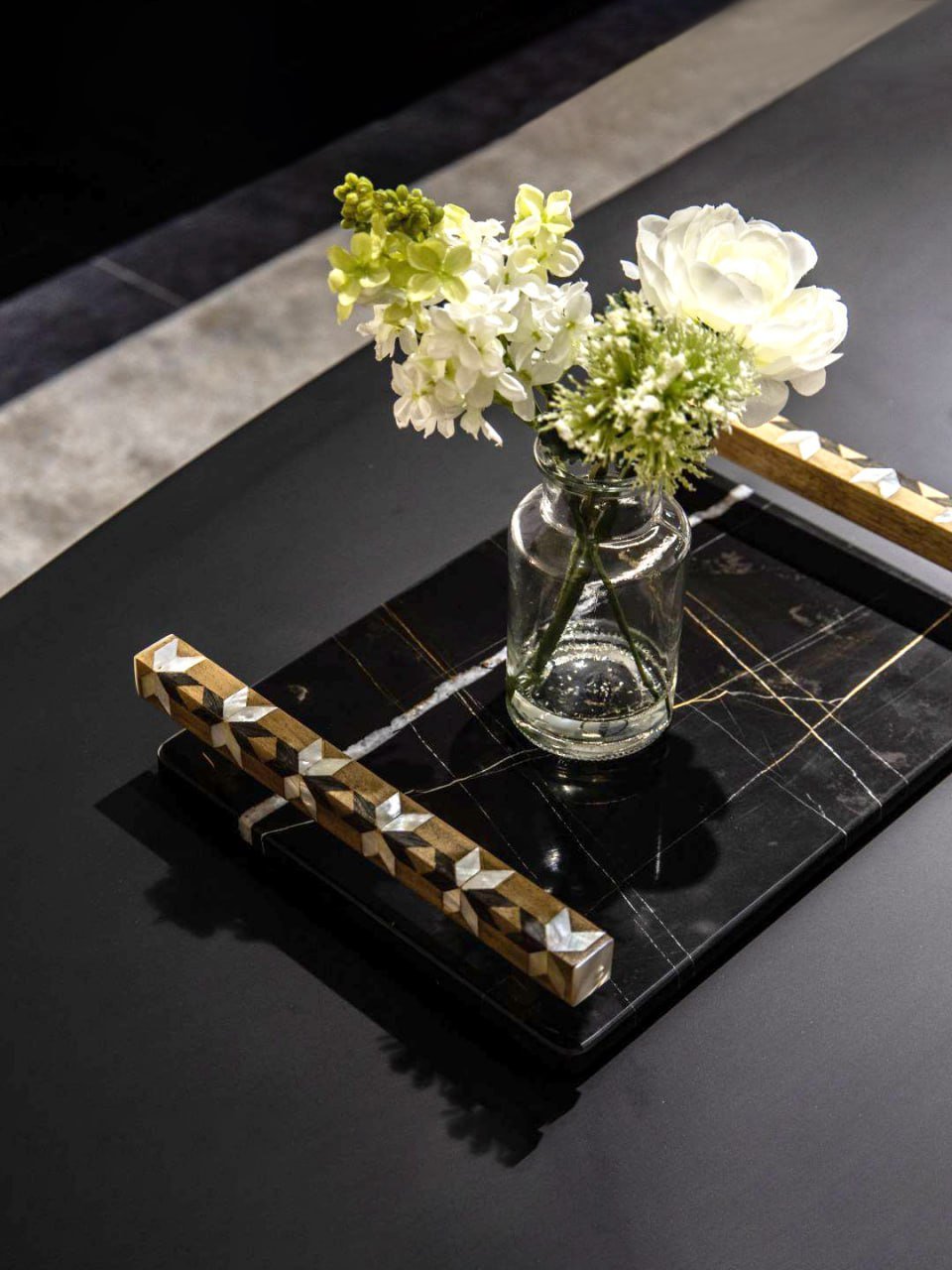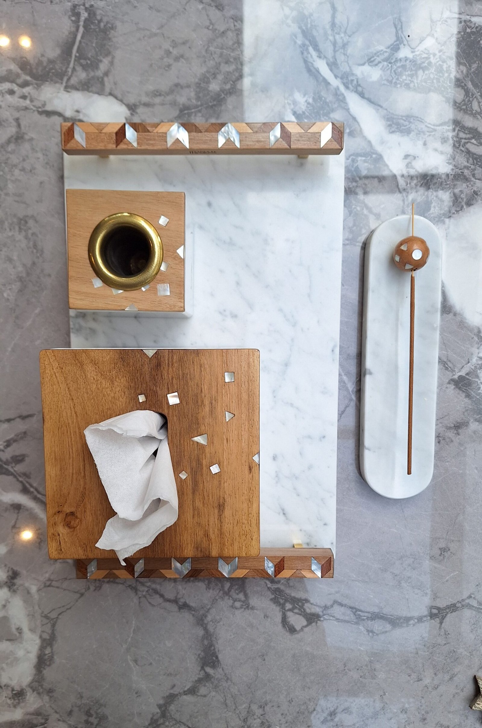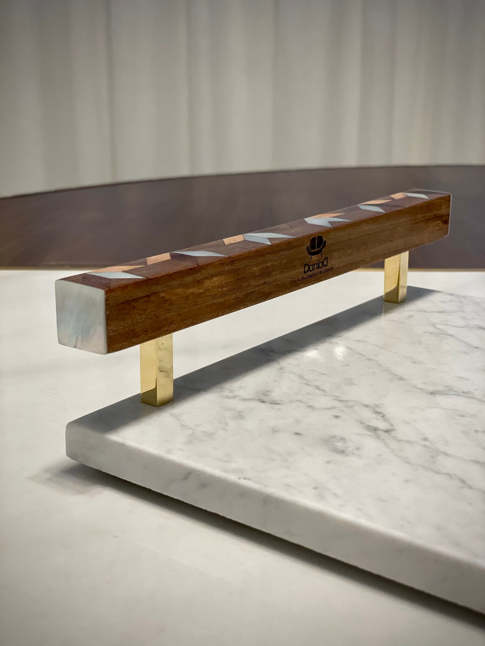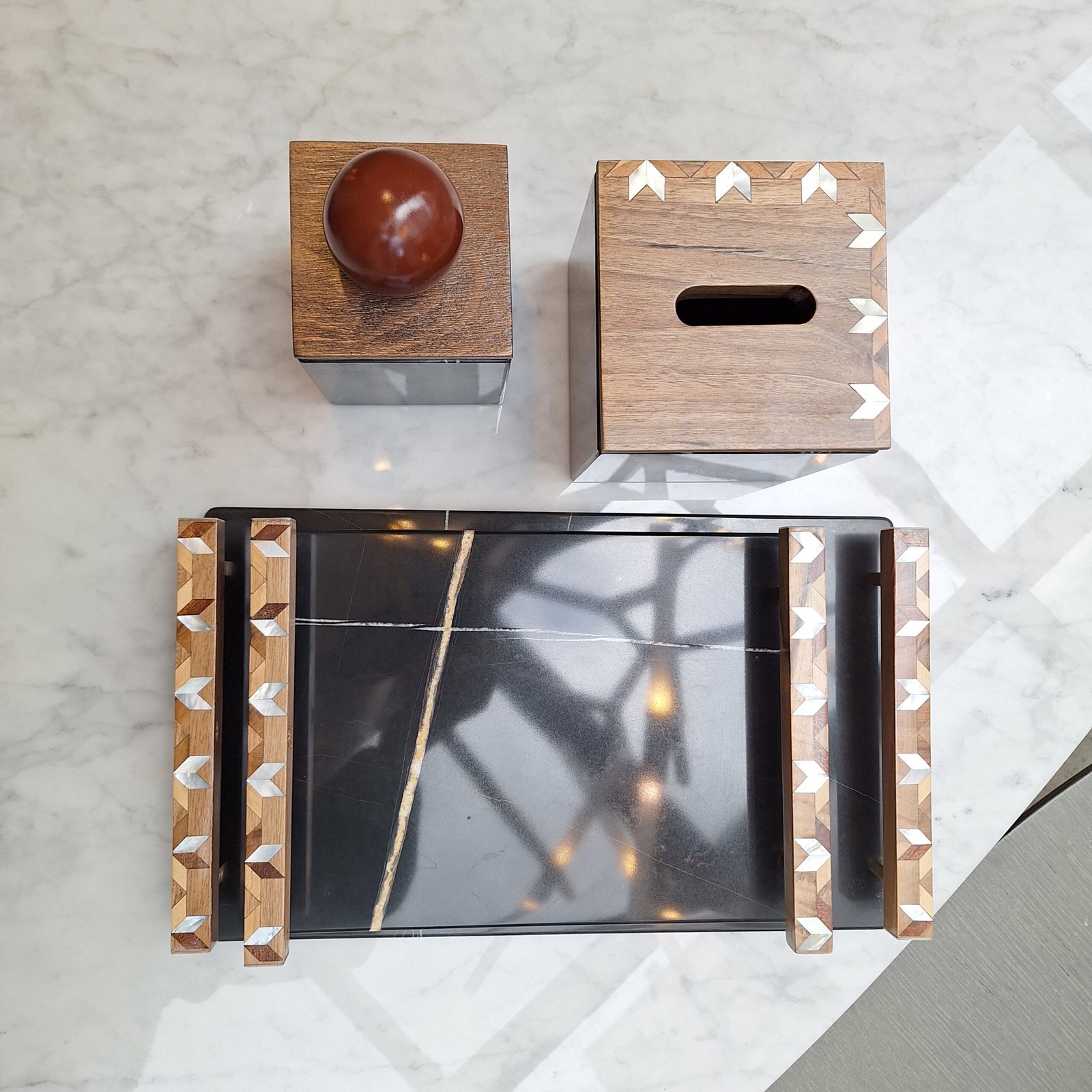 Made of Marble, wood, and mother-of-pearl.
