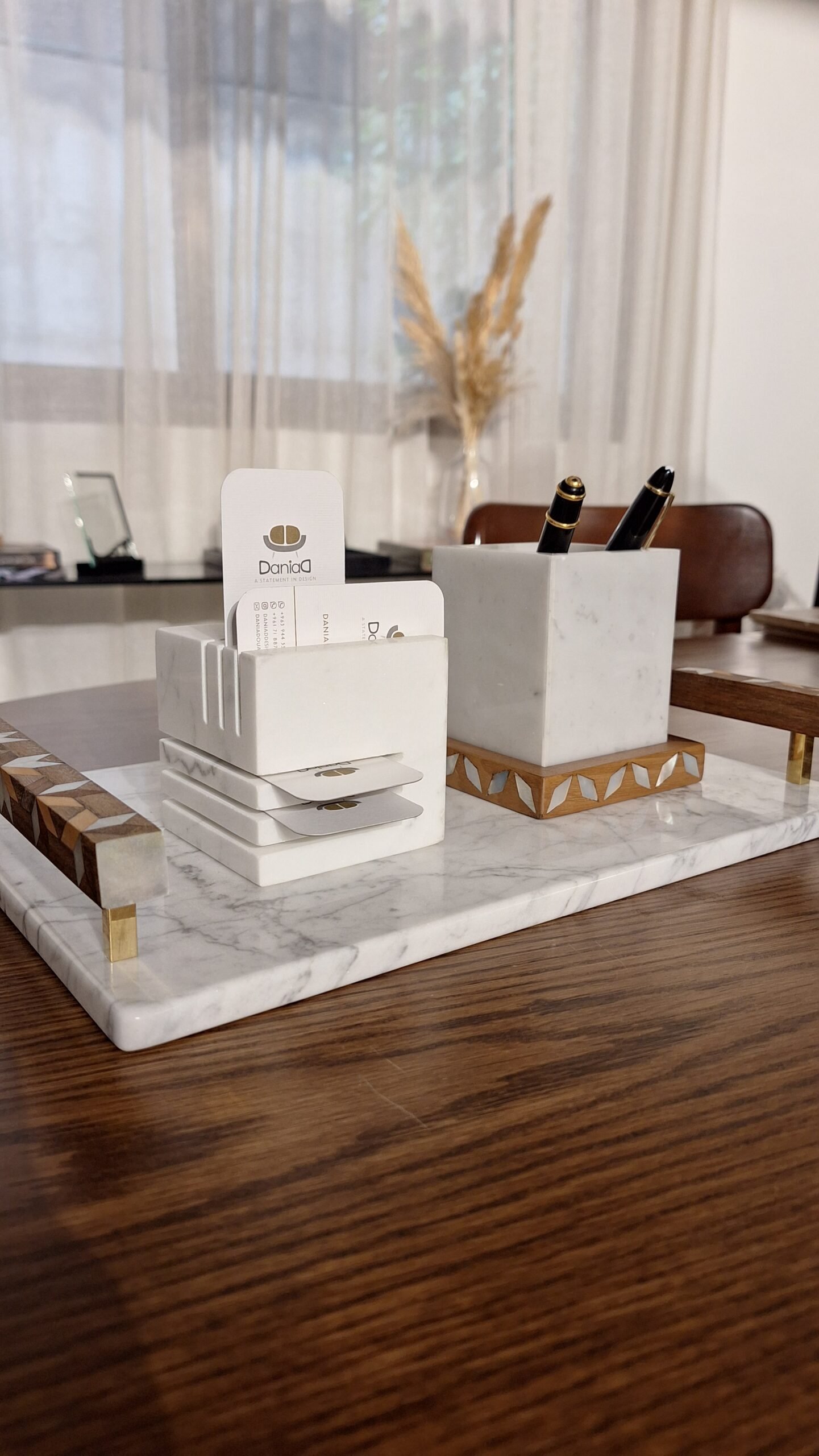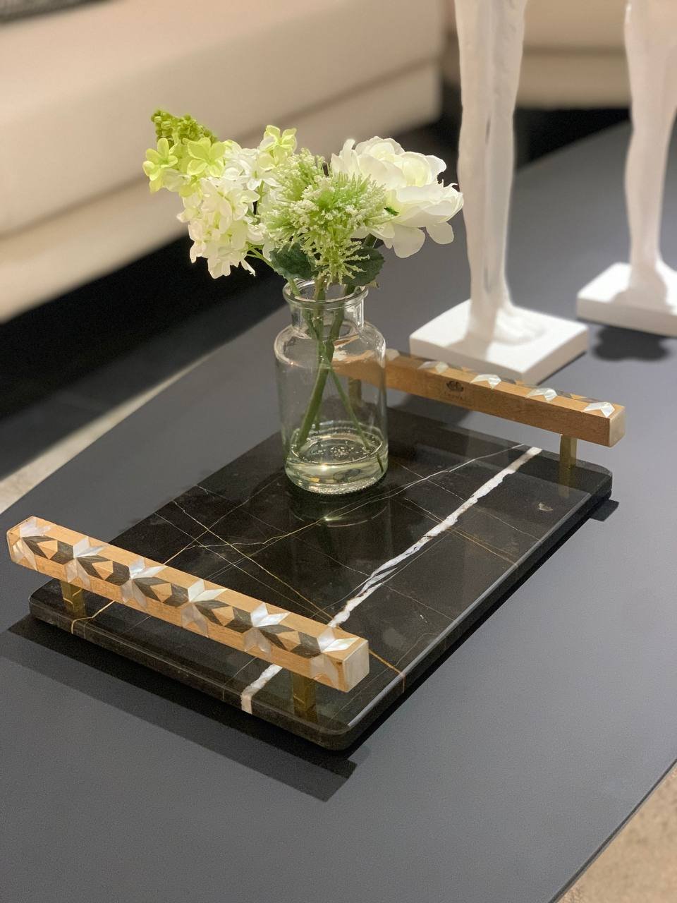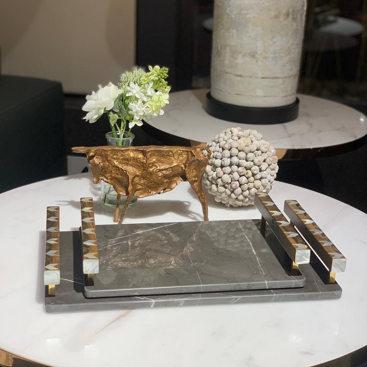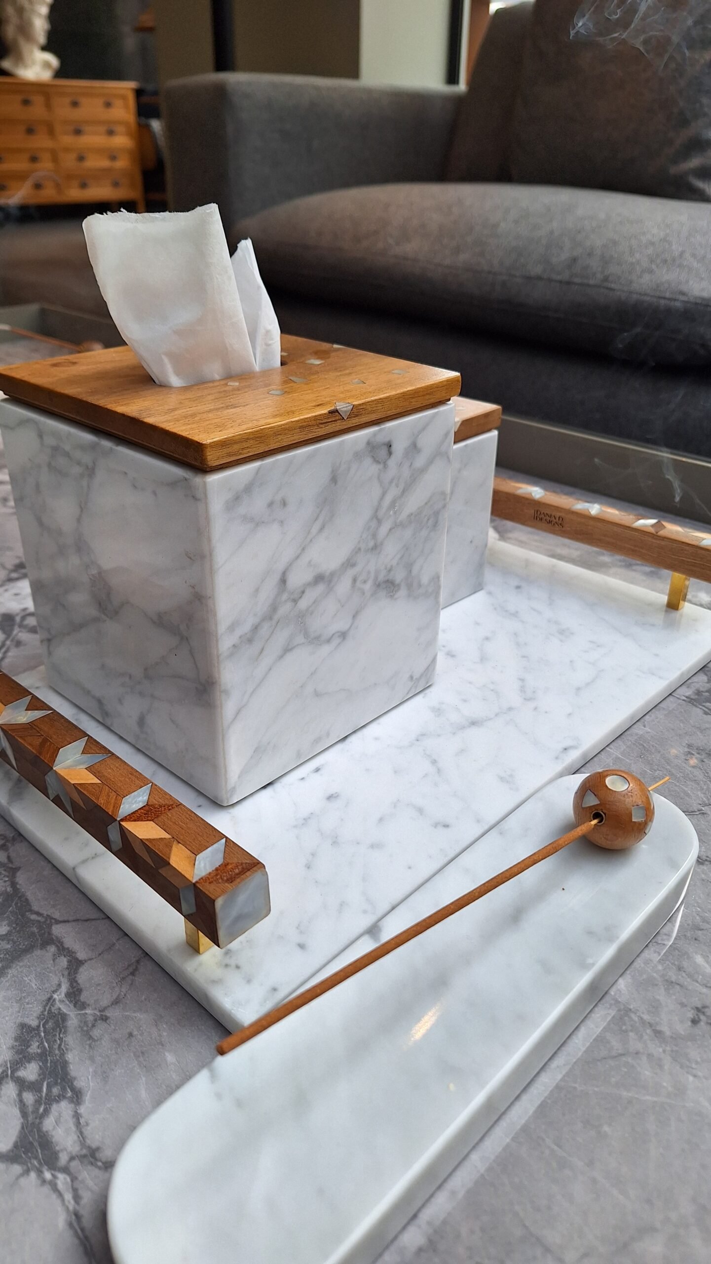 Made of Marble, wood, and mother-of-pearl.