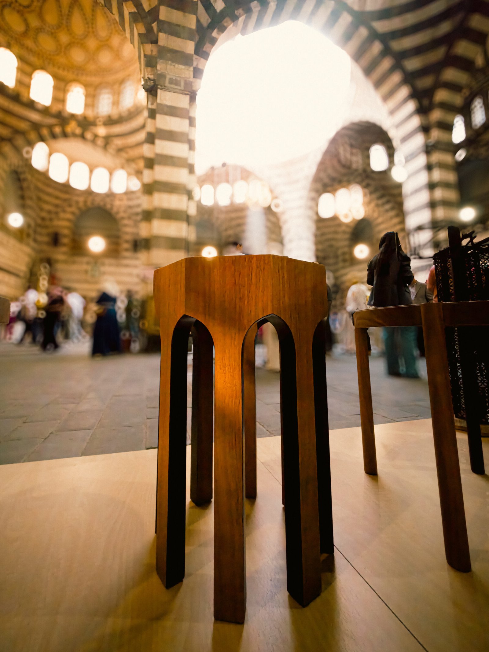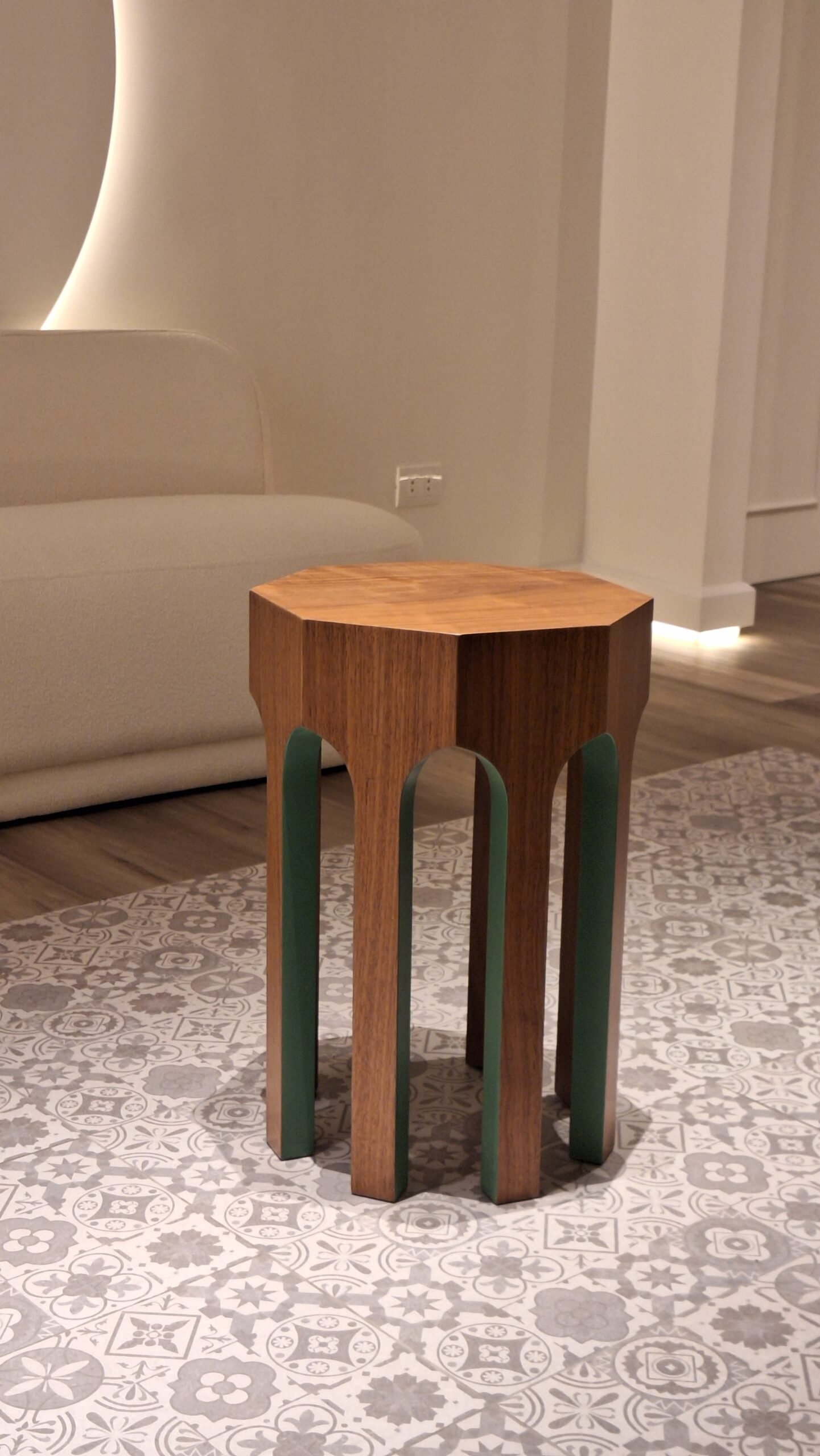 A contemporary side table inspired by architectural forms. Featuring an octagonal wooden top and sculpted legs with arched cut-outs highlighted in green, this piece brings a subtle play of geometry and contrast. Its compact design makes it versatile as a coffee corner piece, bedside table, or living room accent, offering both practicality and artistic character.