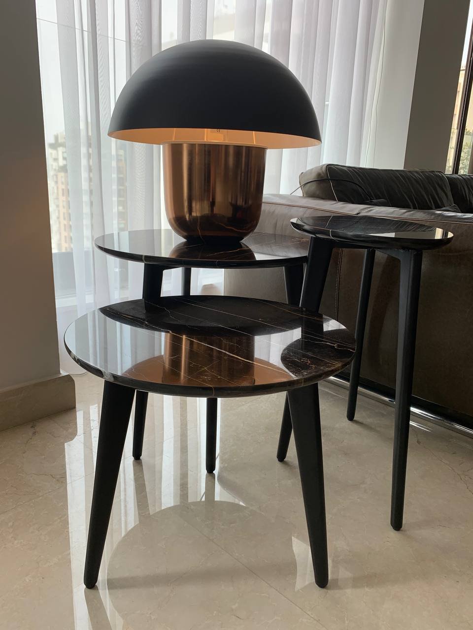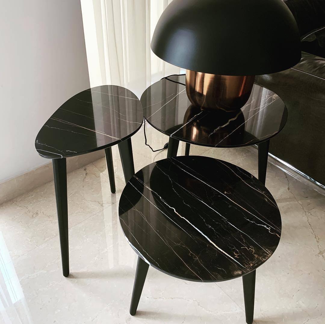 A distinctive set of side tables crafted with Tala Noir marble, designed to celebrate organic form and refined material contrast. Each table features a uniquely shaped marble top, allowing the set to feel sculptural and dynamic rather than uniform. The natural veining of the black marble adds depth and character, making every piece one of a kind.